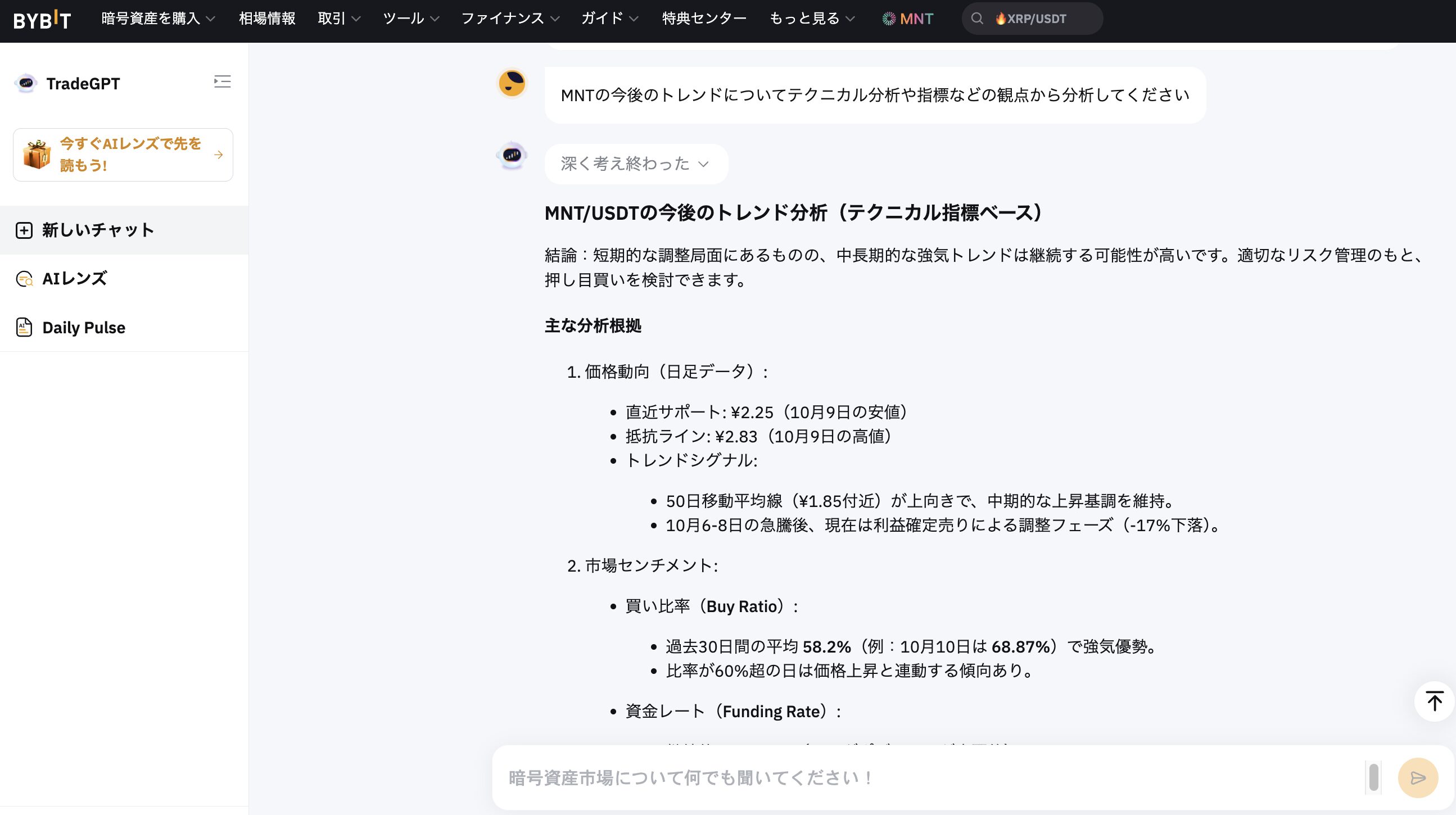 - TradeGPTは、ChatGPT活用したBYBIT独自のAI分析のチャット型ツール。