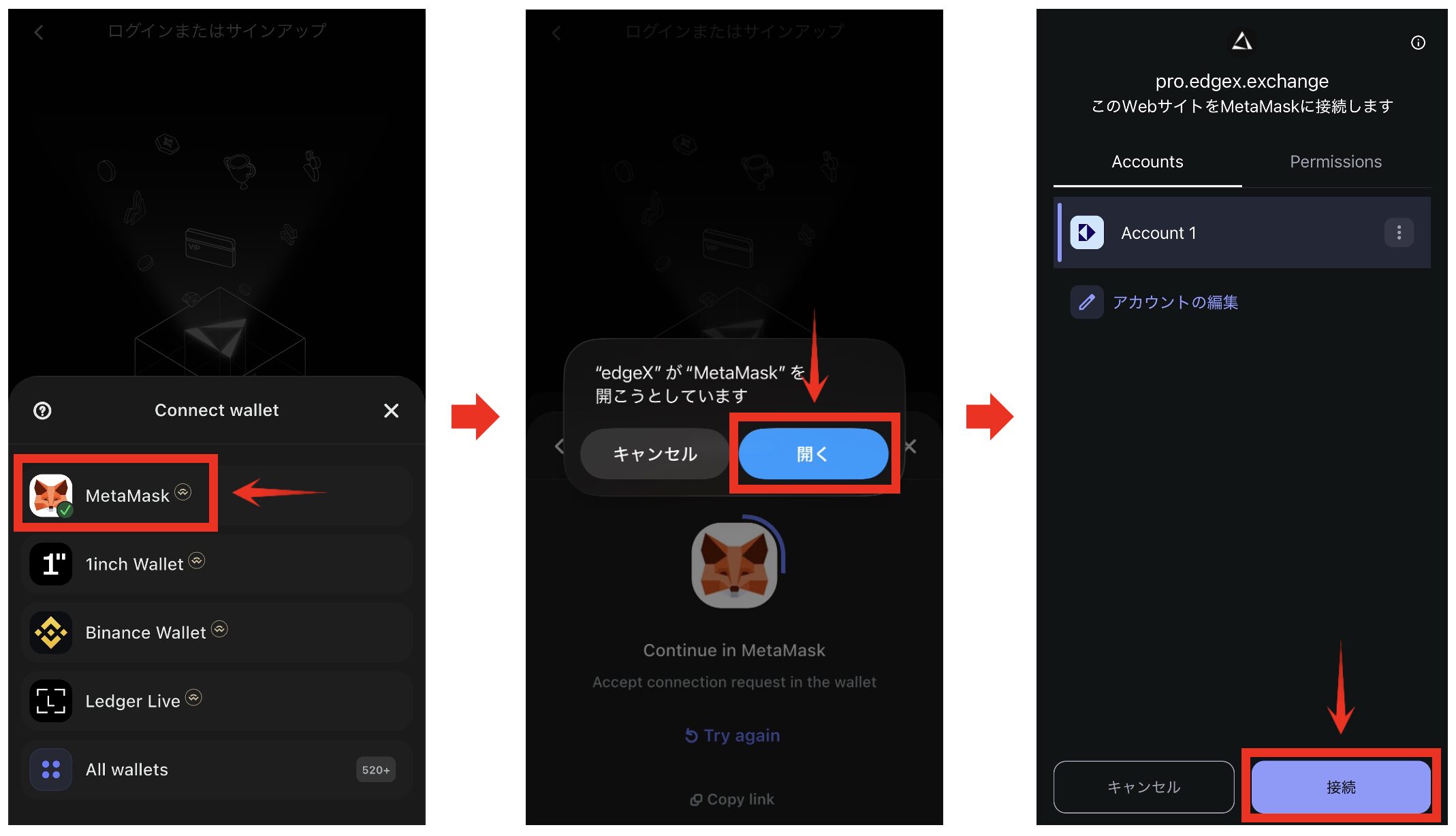 - メタマスクからedgeXのページに戻ります。