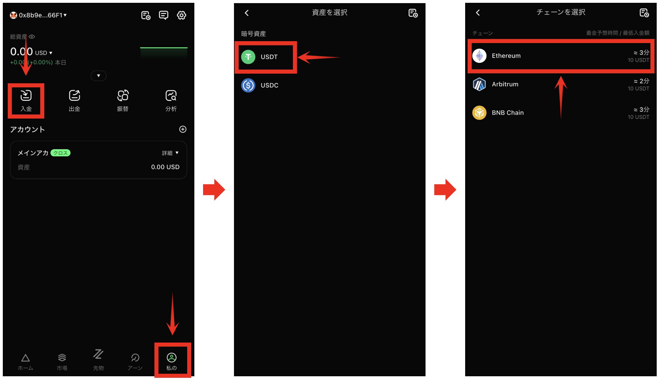 ※メアドで登録された方は、入金をタップするとUSDTの送金アドレスが表示されるので、他のウォレットからそのアドレス宛に取引したい枚数を送金しましょう。