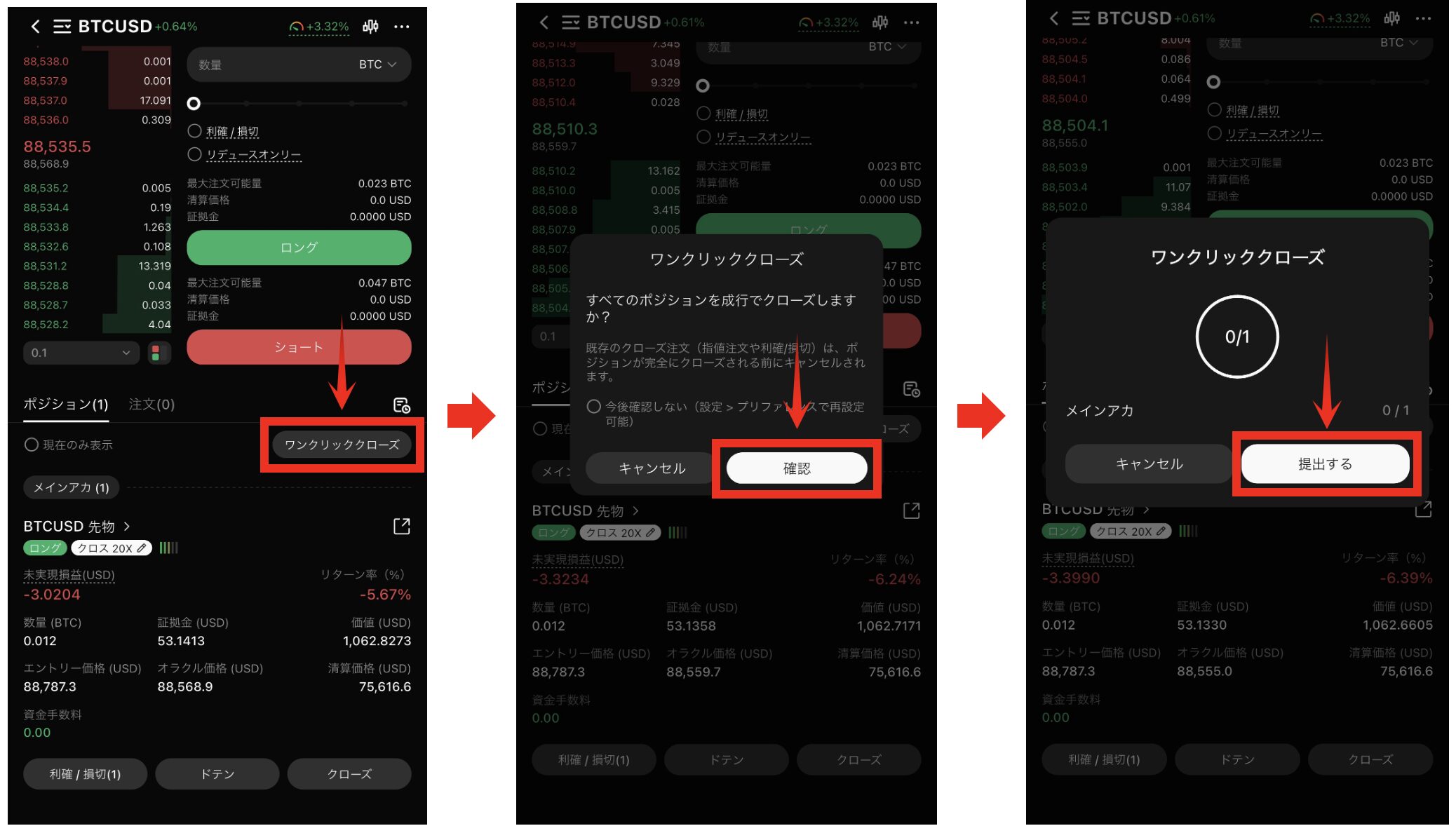 - 取引画面の下側にあるワンクリッククローズをタップします。