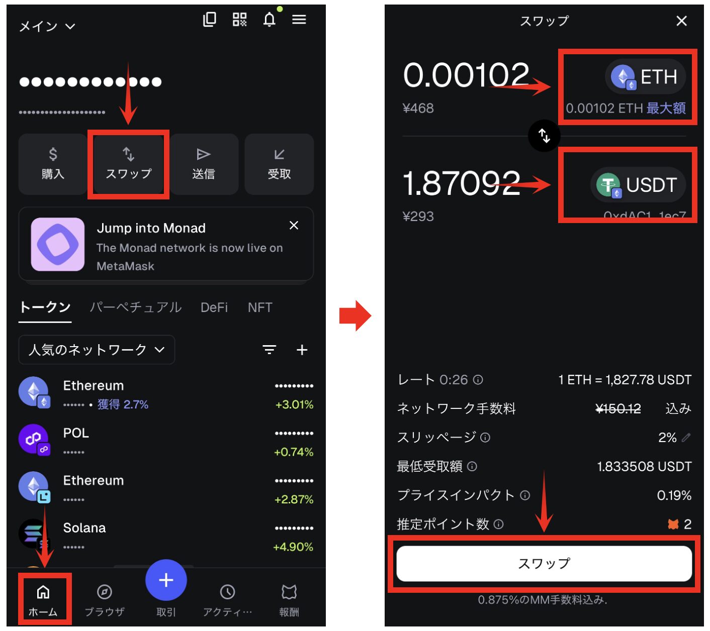 - スワップをタップしてUSDTに両替完了です!