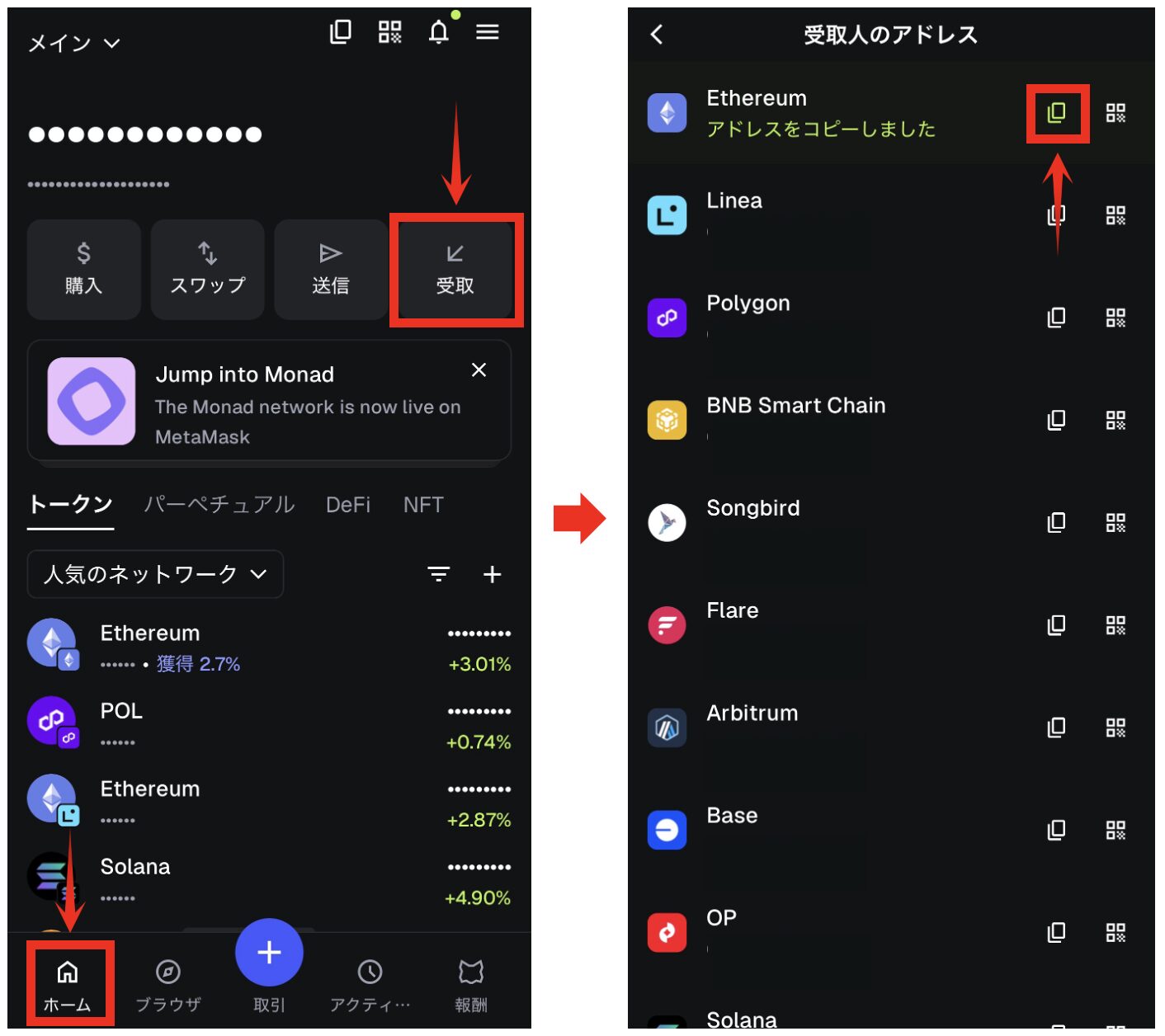 - メタマスクを開きホームをタップします。