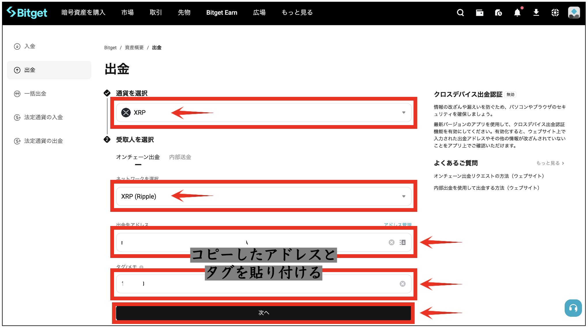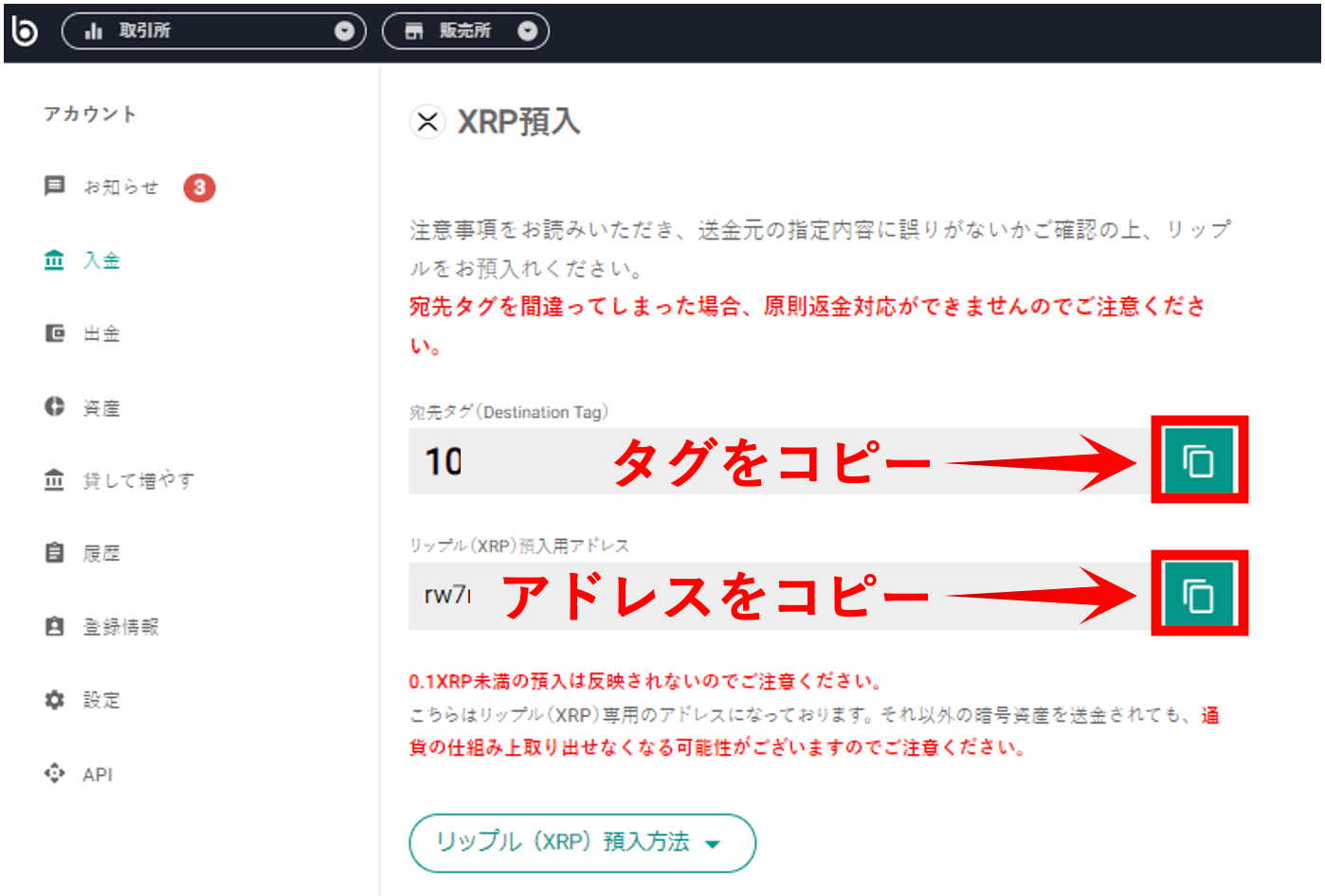 • 先ほどビットバンクでコピーしたXRPのアドレスとタグを貼り付けます。