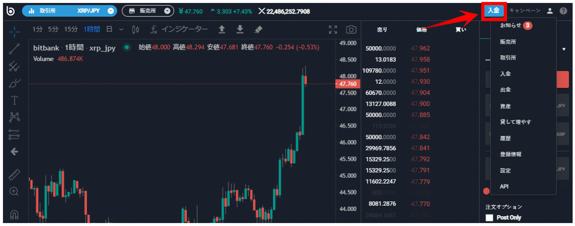 ビットバンクにXRPが着金したら、売ってJPY(日本円)にする手順になります。